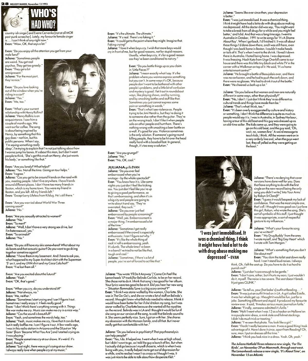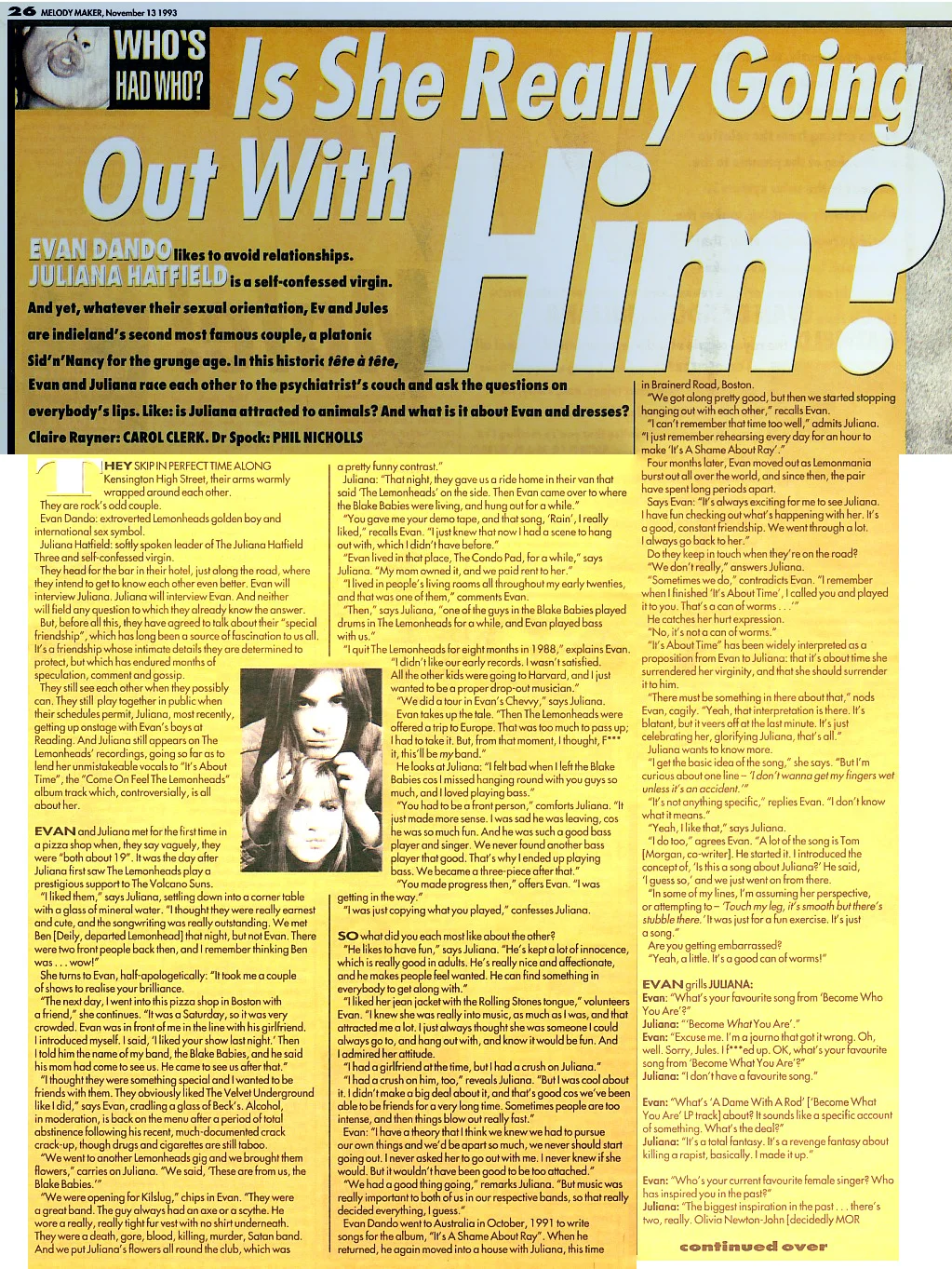 Juliana and Evan Dando interviewed by Melody Maker in November 1993 at what was probably the height of the annoying representation of Juliana in the music papers.