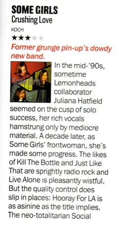 The album is well produced musically with enough pop hooks to satisfy although some of the lyrics have a demo ‘quality’ – possibly an unfinished collection of random thoughts, particularly Juliana’s. The wish to discipline a man for spilling beer on her cleavage?! in the curious Social Control and Hooray for LA’s ‘celebration’ of stereotypical descriptions of Los Angeles suggesting Juliana’s drifting thoughts put to paper. They also appear to be the motivation behind Rock Or Pop, complete with it’s tinkly piano: